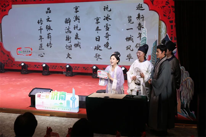 活动现场,情景剧《再聚历下亭·共赏泉城景》让李白、杜甫、辛弃疾、李清照等历史名士“穿越”古今,以生动幽默形式展现济南特色文旅资源与深厚城市文化,并创意推介新春年俗、冰雪奇境、潮玩泉城、文脉薪传,诚邀全国游客 “马上”游济南,品年味、赏泉景、享欢乐,共赴泉城新春文旅盛宴。