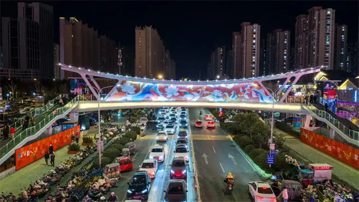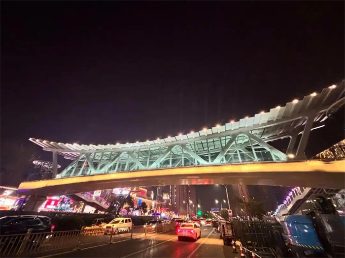 不同于传统过街天桥的单一功能,印象济南天桥在设计上充分考虑了实用性与美观性的统一。桥梁整体呈“C”字形布局,桥下净空5米,既保障了车辆通行高度,又通过流畅的曲线造型融入周边商业环境,视觉通透、不遮挡视线。同时项目结合全龄友好理念,进行无障碍设计,配备两部直梯及1:4 梯道、推行坡道,保障市民安全高效通行。