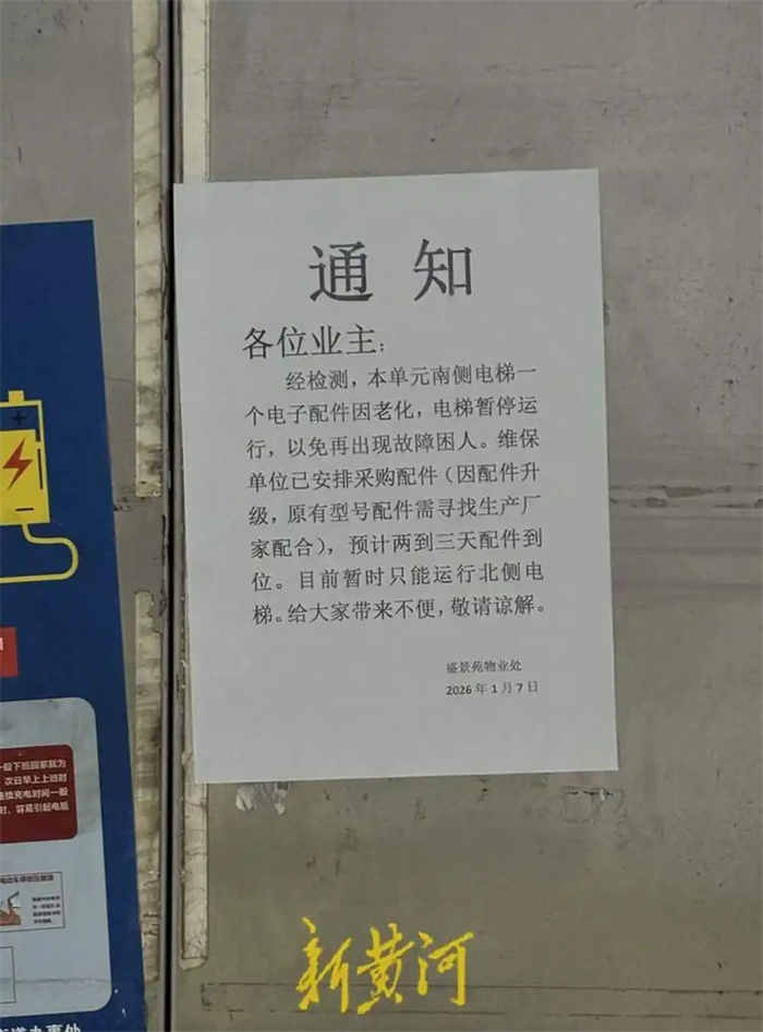 1月8日下午,记者在盛景苑16号楼实地探访发现。该楼共34层,每层约6户,虽然配备了两部电梯,但南侧电梯已停止运行。电梯门上张贴的通知显示,停运原因是“一个电子配件老化”,物业方表示“已安排采购配件,预计两到三天到位”,并提示“以免再出现故障困人”。